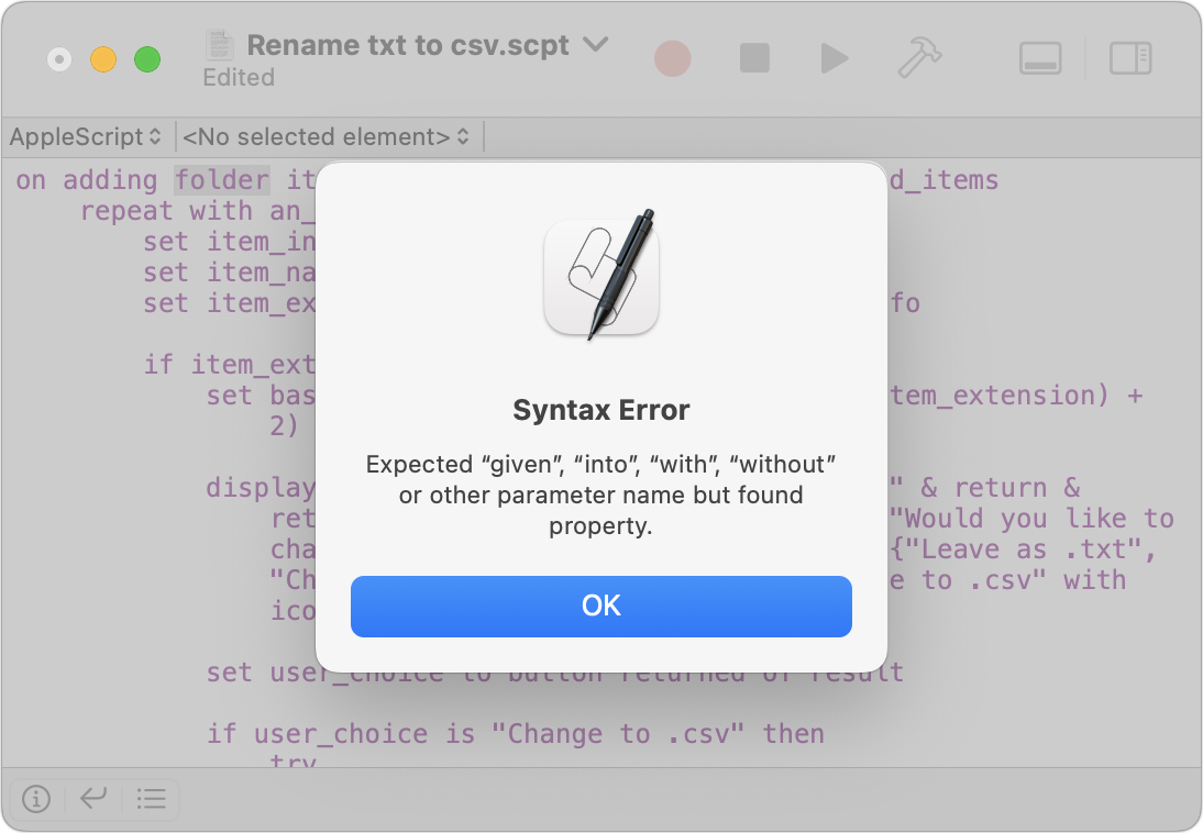 - Script Editor complains about syntax errors: Report the error to the chatbot by taking a screenshot like the one below and pasting or dragging it into the chatbot text entry field. It will analyze the screenshot to identify the error and try to provide you with revamped code that fixes the problem.
