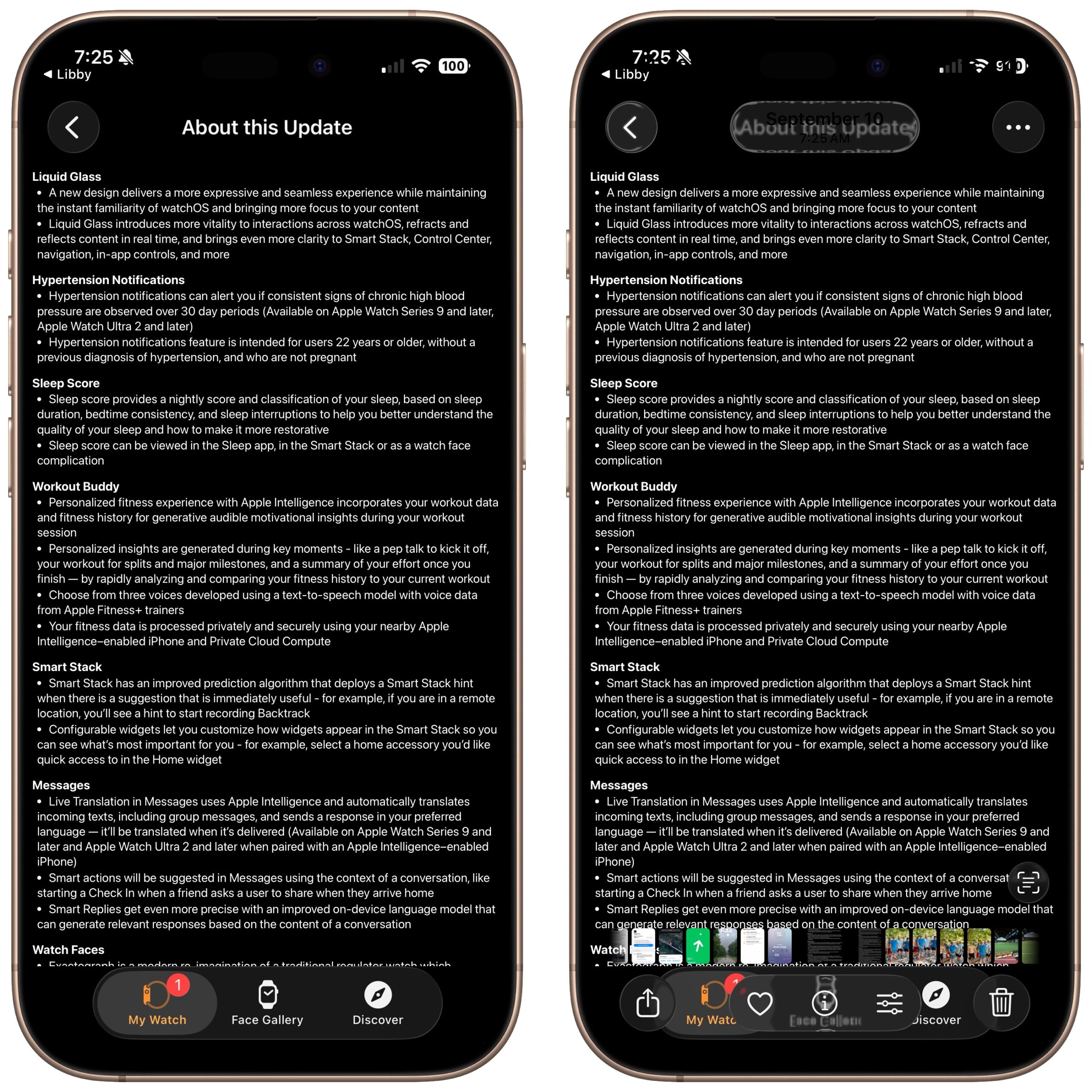 - Readability: When Liquid Glass displays light gray text on a clear control positioned over a dark background with additional text, it becomes almost unreadable. While this is an extreme case, many floating translucent controls over backgrounds can cause legibility issues, especially for those whose vision isn’t perfect. As you can see in this screenshot of iOS 26’s release notes (below, left), the Liquid Glass controls in Photos are notably awkward (below, right).